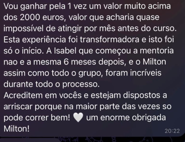 “Esta cursoria é a escolha ideal para as pessoas que querem fazer algo mais mas não sabem como. O conhecimento que o Milton transmite e a forma como ele nos desafia a pensar é fascinante e abre horizontes, quando achamos que não há solução para os nossos problemas! Melhor decisão de 2023!”