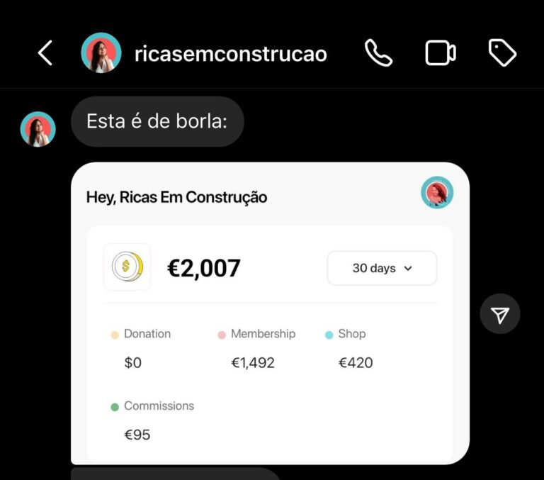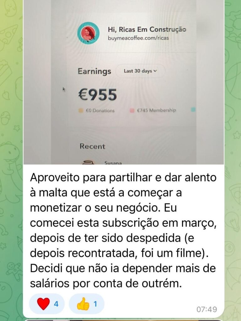 Mas logo depois a Margarida que faturou mais de 700€ em 24h em subscrições para a sua comunidade (já vamos falar sobre o modelo mais à frente), partilhou comigo outra imagem do seu Dashboard onde se via que já tinha duplicado a receita.
