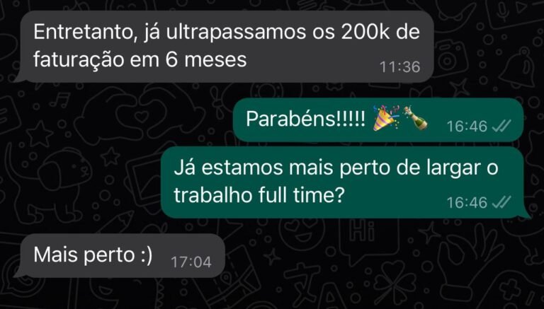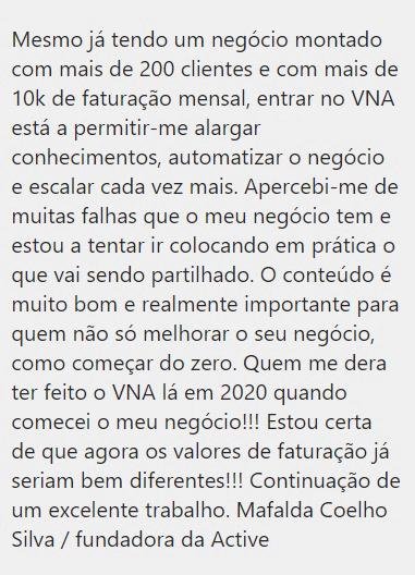 Na altura em que estou a escrever isto, faz praticamente 1 ano que lancei o VNA (Viver de Negócios Automatizados) e foi com enorme prazer que recebi esta mensagem de uma aluna do VNA (que depois seguiu para o programa ELITE)