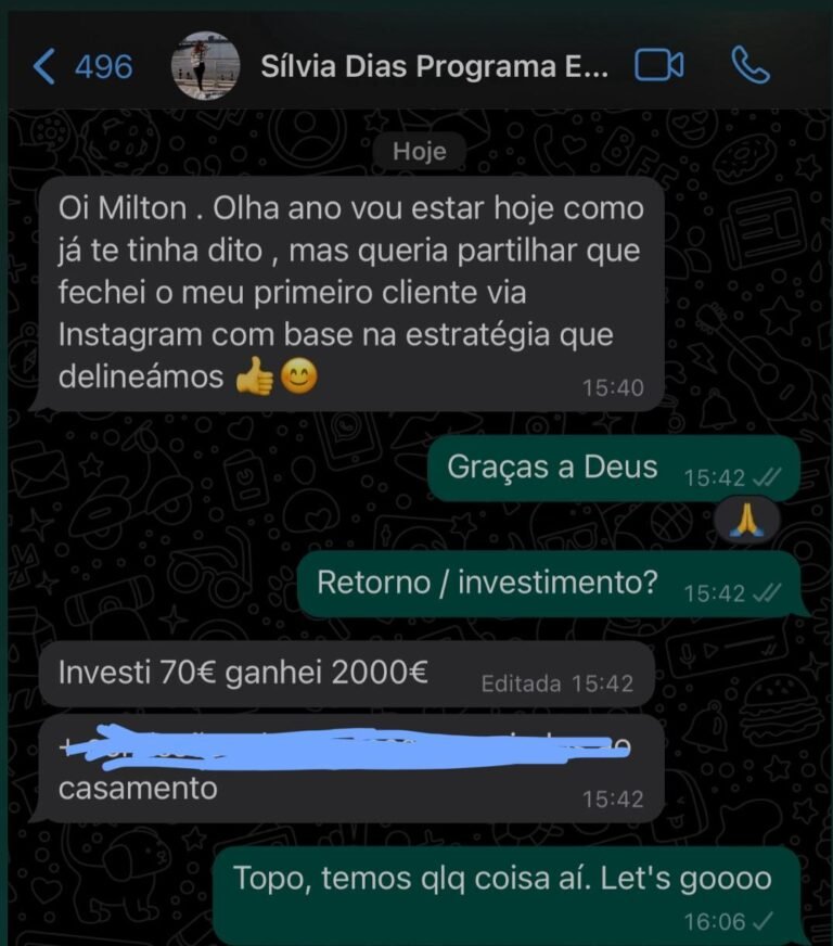 Ela apostou numa estratégia que delineámos juntos. Resultado? Fechou o seu primeiro cliente via Instagram com um investimento inicial de apenas 70€. Retorno? Espantosos 2000€.